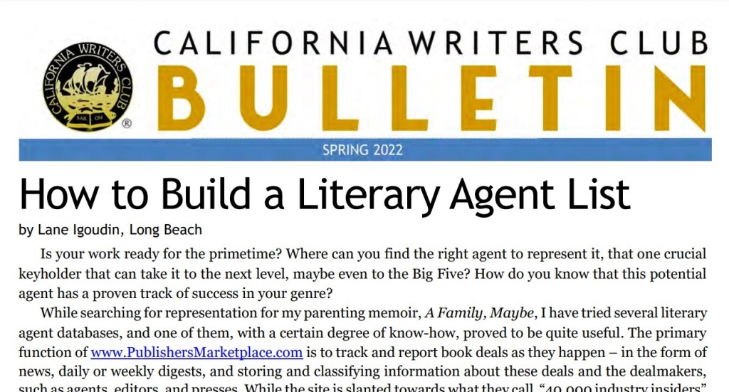 My advice piece for fellow writers on how to find and build a list of prospective literary agents landed on the front page of the California Writers Club quarterly newsletter. Click below to read it.