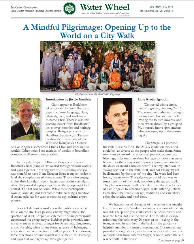 In April 2022, I took part in a pilgrimage walk from Zen Center Los Angeles to Dharma Vijaya, a Sri Lankan Buddhist vihara (temple), a 5-mile roundtrip hike through the heart of urban LA. What started afterwards as an individual article turned into a rich, collaborative piece in the current issue of Water Wheel, ZCLA’s quarterly, reflecting on the walk and the important lessons I learned from it.