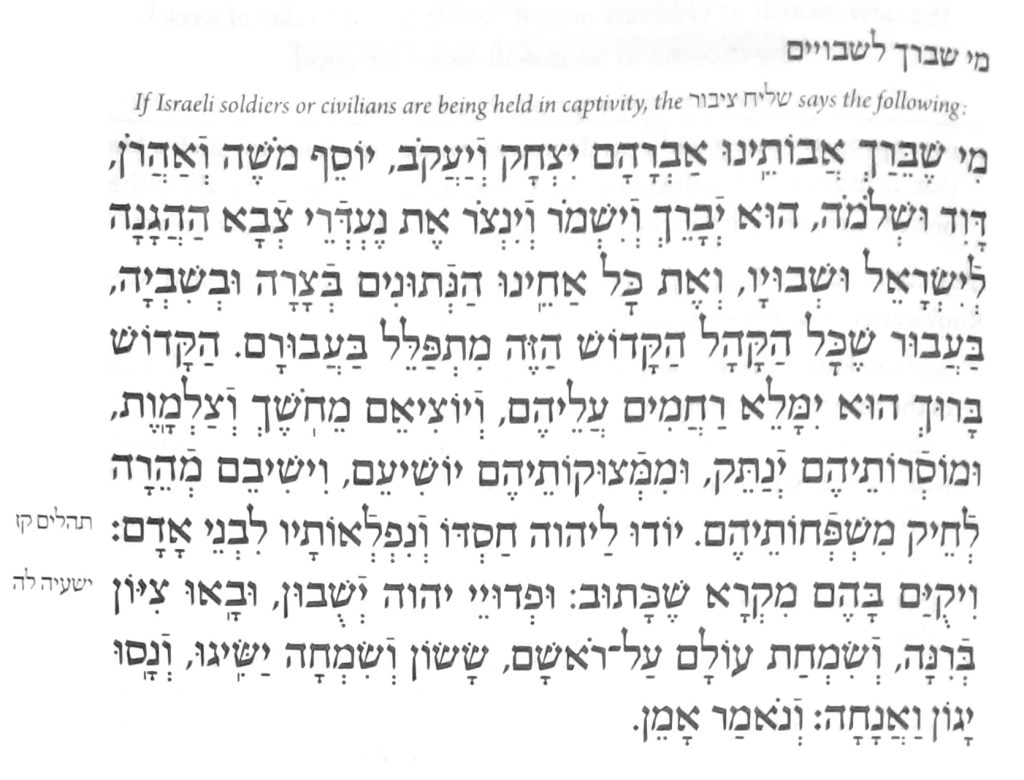 May He who blessed our ancestors, Abraham, Isaac, Jacob, Joseph, Moses, Aaron, David and Solomon, bless, protect, and guard the members of Israel’s Defense Forces missing in action or held captive, and other captives among our brethren, the whole House of Israel, who are in distress and captivity [as we, the members of this holy congregation, pray on their behalf].