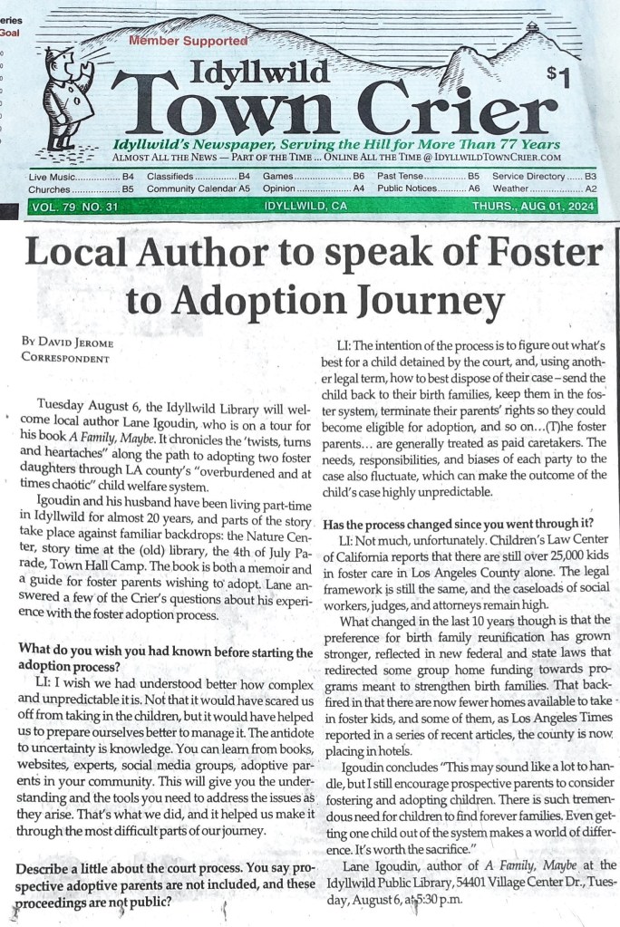 Tuesday August 6, the Idyllwild Library will welcome local author Lane Igoudin, who is on a tour for his book A Family, Maybe. It chronicles the ‘twists, turns, and heartaches” along the path to adopting two foster daughters through LA county’s “overburdened and at times chaotic” child welfare system.