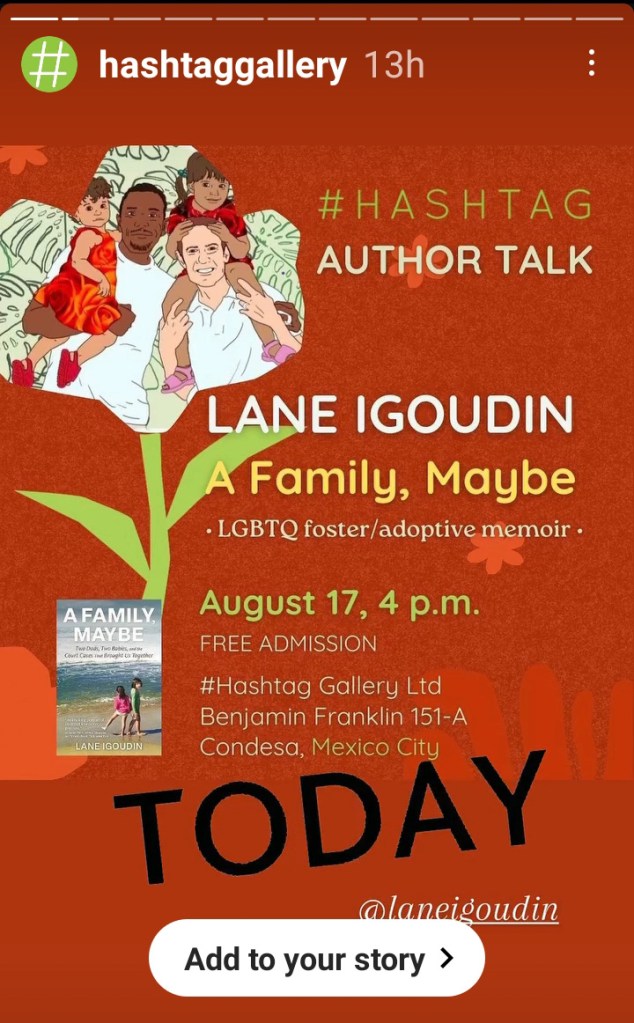 Tour stop #8: an author talk on a rainy night in Mexico City. I was hosted by Graeme Lowy, a Canadian graphic artist, at #Hashtag Gallery, his trendy, modern art gallery in the Condesa neighborhood.