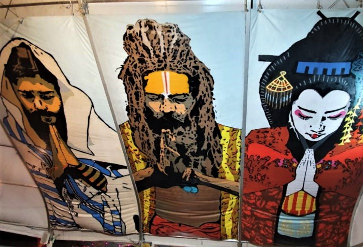 Art above: Namaste Jerusalem, a series of large canvas murals that meet like praying hands over Jerusalem’s renovated First (Train) Station (‘ha-Tahana ha-Rishona‘).