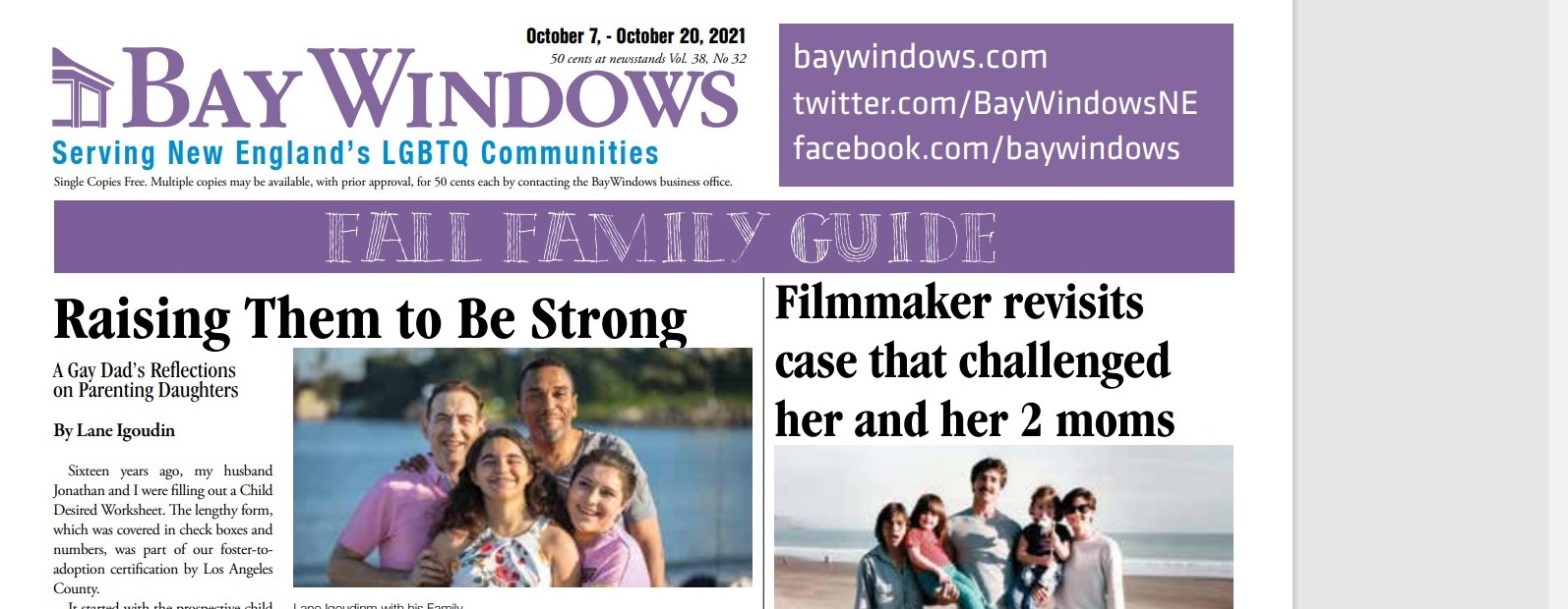 Bay Windows, Boston-based LGBTQ newspaper and news site, appoached me asking to reprint “Raising Them to Be Strong: A Gay Dad’s Reflections on Parenting Daughters,” my Father’s Day article published earlier this year by Family Equality, the nationwide gay family advocacy organization. I gladly said yes and am delighted to see it both on theContinue reading ““Raising Them to Be Strong” Featured in Bay Windows”